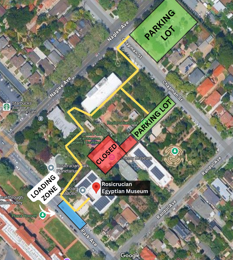 Currently, parking is available in the green areas on the map below, as well as street parking on Naglee Ave, Chapman Ave, and Randol Ave. We have a passenger loading zone (marked in blue) in front of the museum to drop off guests before you park and we have a suggested alternate route (marked in yellow) from our parking lots to enjoy a stroll through Rosicrucian Park on your way to the Rosicrucian Egyptian Museum. Construction closures are indicated in red.